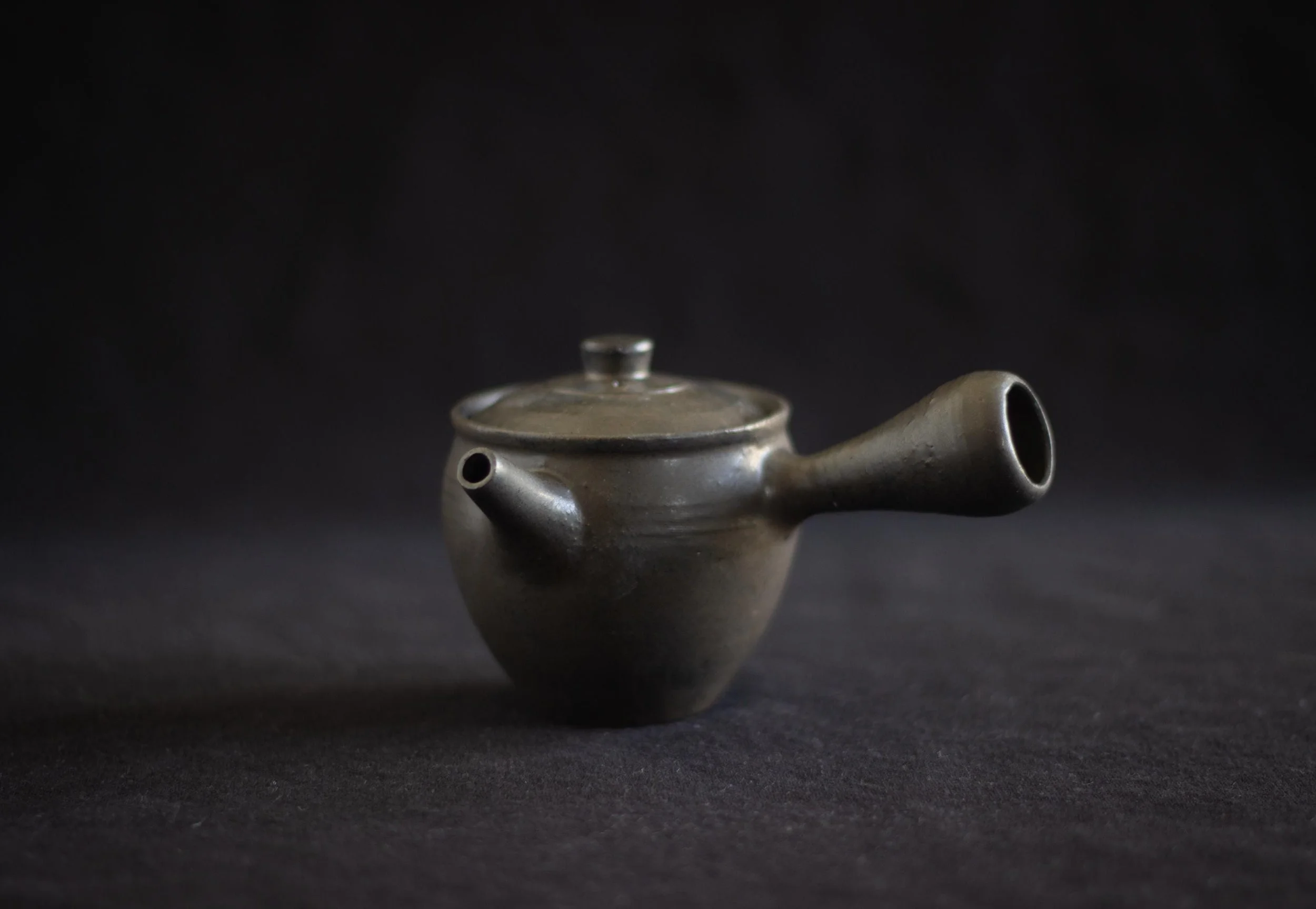 Though kyusu means "tea pot" in Japanese, in the west it is often used to refer specifically to yokode kyūsu- side handled tea pots that allow for easy pouring without touching the hot surface of the pot. This little guy holds about 150ml and features a clay mesh strainer inside to filter the tea leaves from the water when pouring.