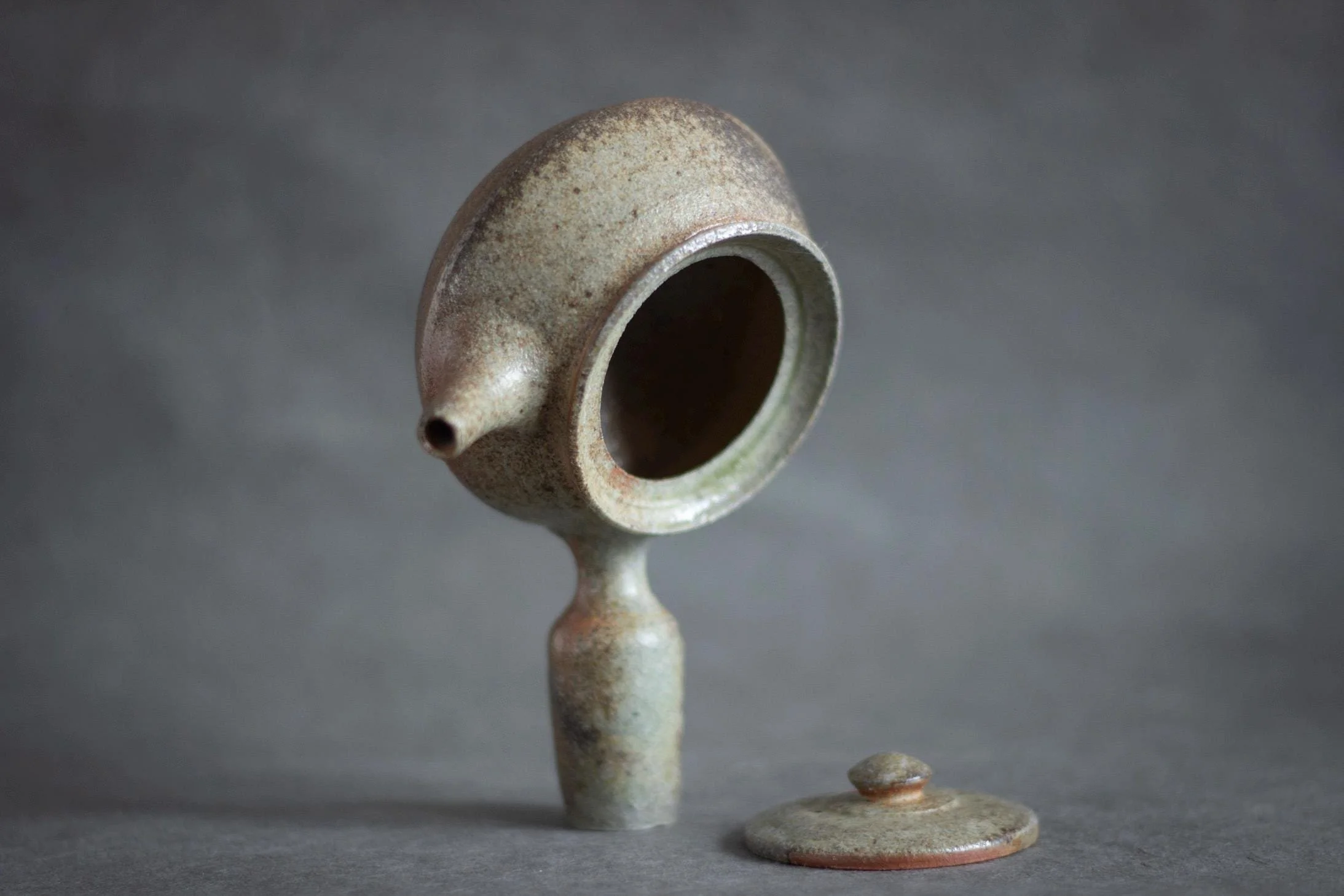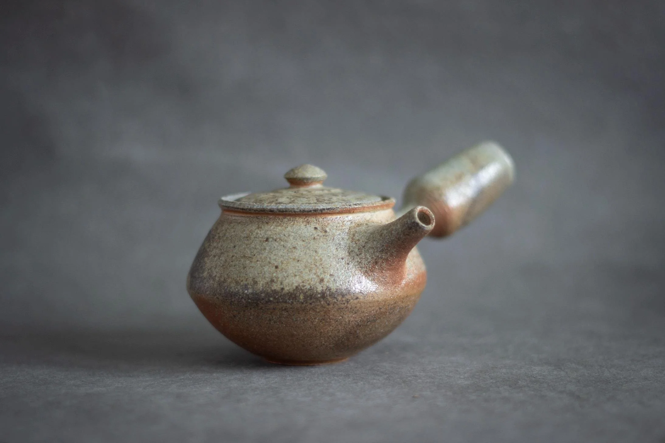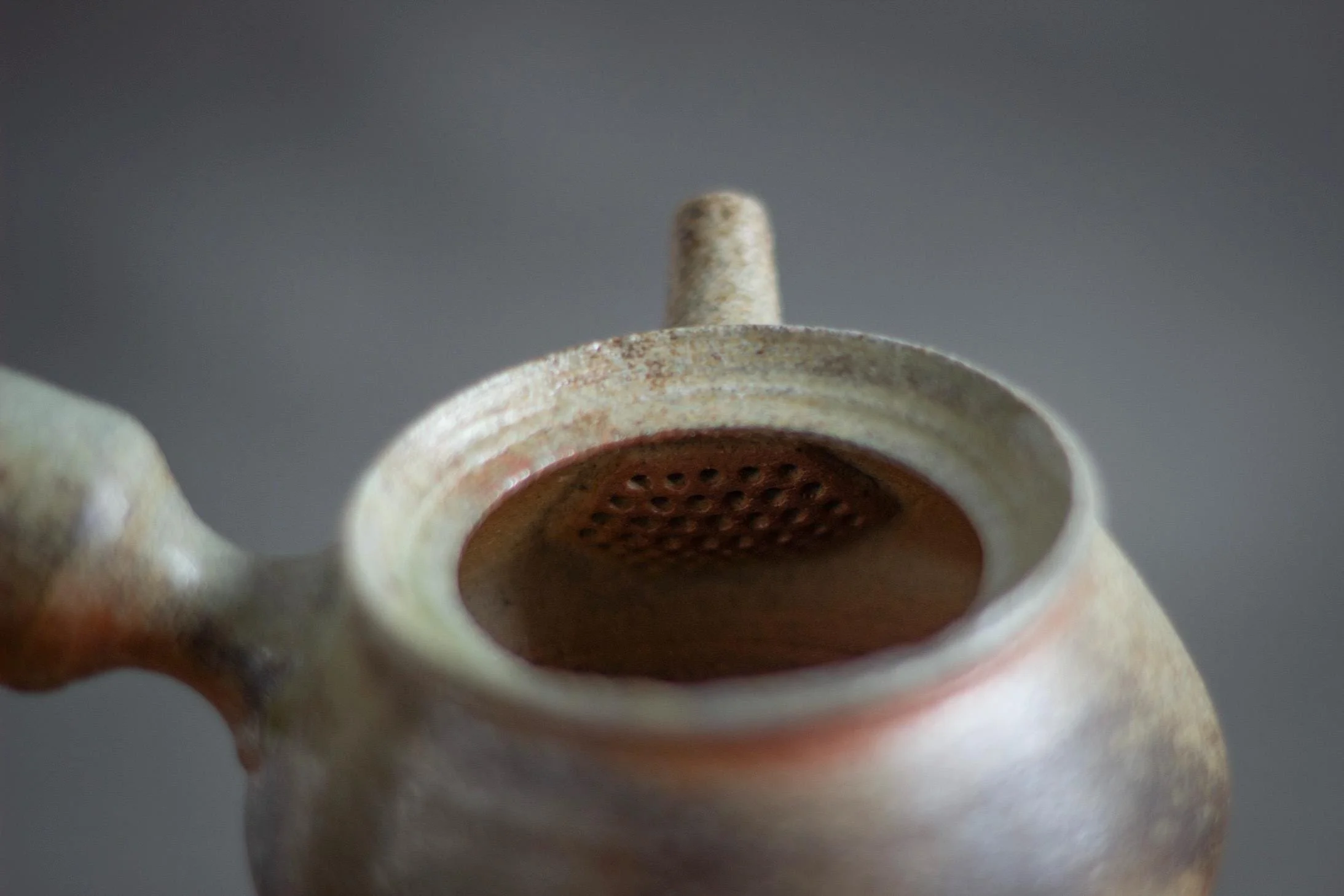 Though kyusu simply means "tea pot" in Japanese, in the west the word is often used to refer specifically to yokode kyūsu- side handled tea pots that allow for easy pouring without touching the hot surface of the pot. This 200ml tea pot features a clay mesh strainer inside to filter the tea leaves from the water when pouring.